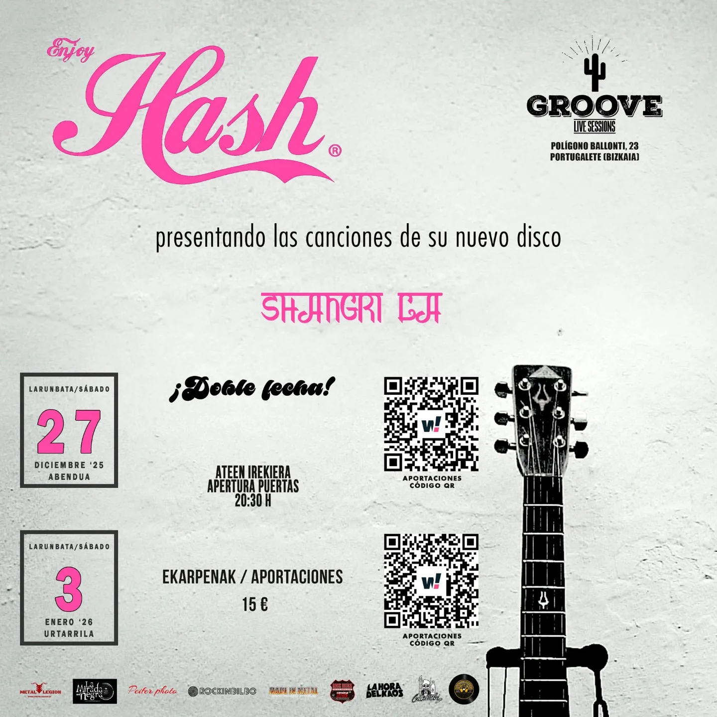 Sábado, 3 de enero de 2026: Hash en Groove - Segunda Live Session - Portugalete Aportaciones online y en sala: 15 € (precio único) https://woutick.com/es/entradas/hash-en-portugalete-segundo-asalto @hashportugalete, la legendaria banda jarrillera que nació de las cenizas de The Flying Rebollos, regresa a los escenarios para presentar el que será su tercer disco de estudio, "Shangri-la". Un...