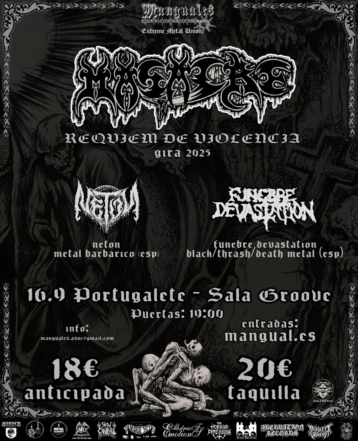 MASACRE (Death Metal - COL) Neton (Metal Bárbarico - ESP) Funebre Devastation (Black/Thrash /Death Metal - ESP) Apertura: 19:00 Aportaciones en: mangual.es ➡️ 18€ anticipada | 20 € taquilla | MASACRE...