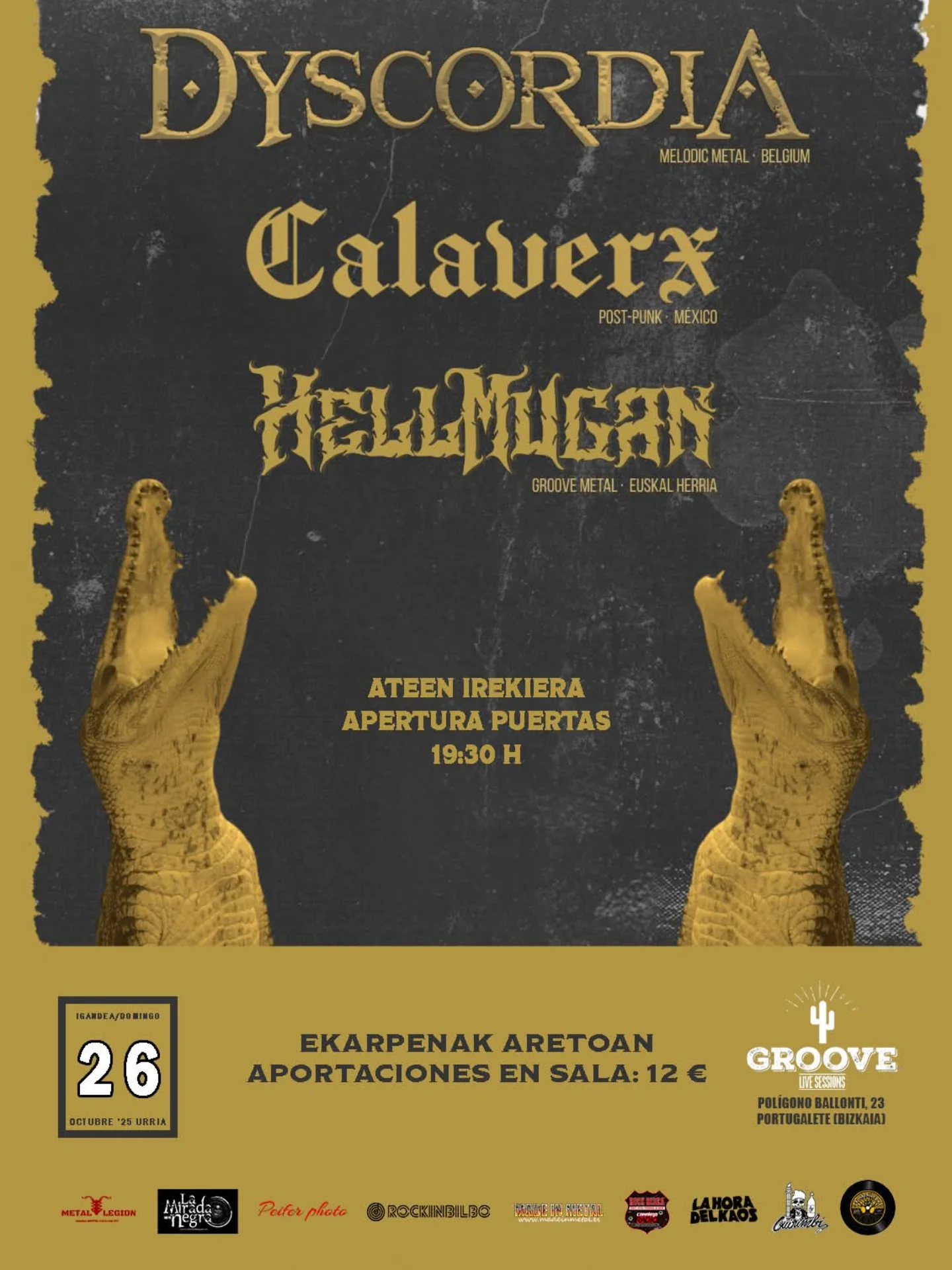 26 de octubre, domingo: Dyscordia + Calaverx + Hellmugan en Groove - Portugalete Aportaciones en sala: 12 € Noche de domingo otoñal ecléctica en Groove con la banda belga de metal melódico progresivo @dyscordiaband, la mexicana de sonidos industriales, postpunk y darkwave @calaverxx, y la guipuzcoana de metal @hellmugan.