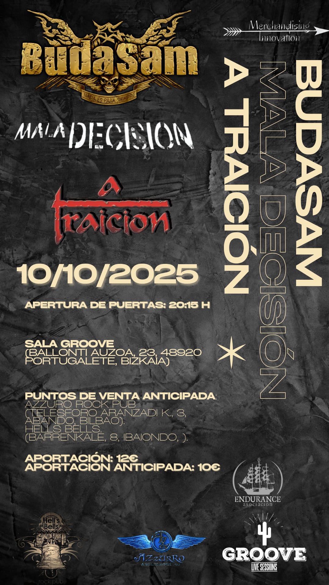 10 de octubre, viernes: Budasam + Mala Decisión + A Traición en Groove - Portugalete Aportaciones anticipadas: 10 € + gastos de gestiónDisponibles en Azzurro Rock Pub y Hells Bells. Aportaciones en...