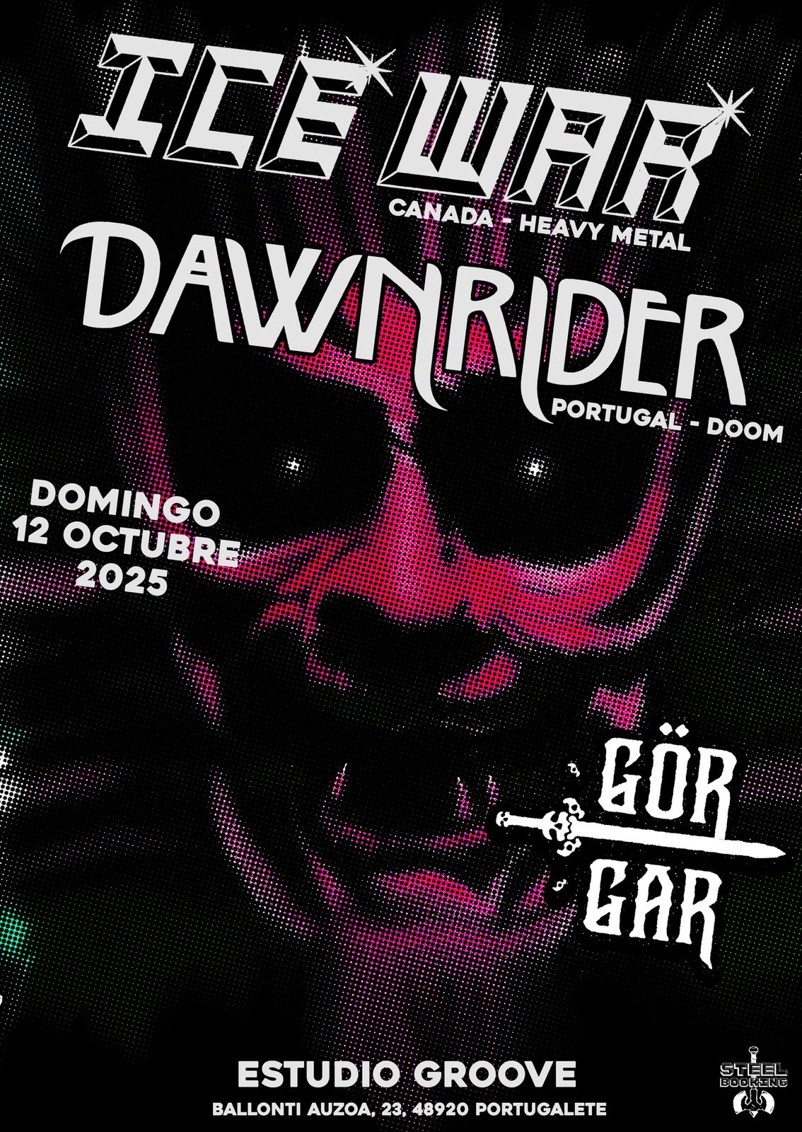 12 de octubre, domingo: Ice War (Canada heavy metal) + Dawnrider + Görgar Aportaciones anticipadas: 15 € + gastos de gestión https://woutick.com/en/tickets/ice-war-dawnrider-gor-gar-en-portugalete Aportaciones en sala: 18 € Tres bandas de...