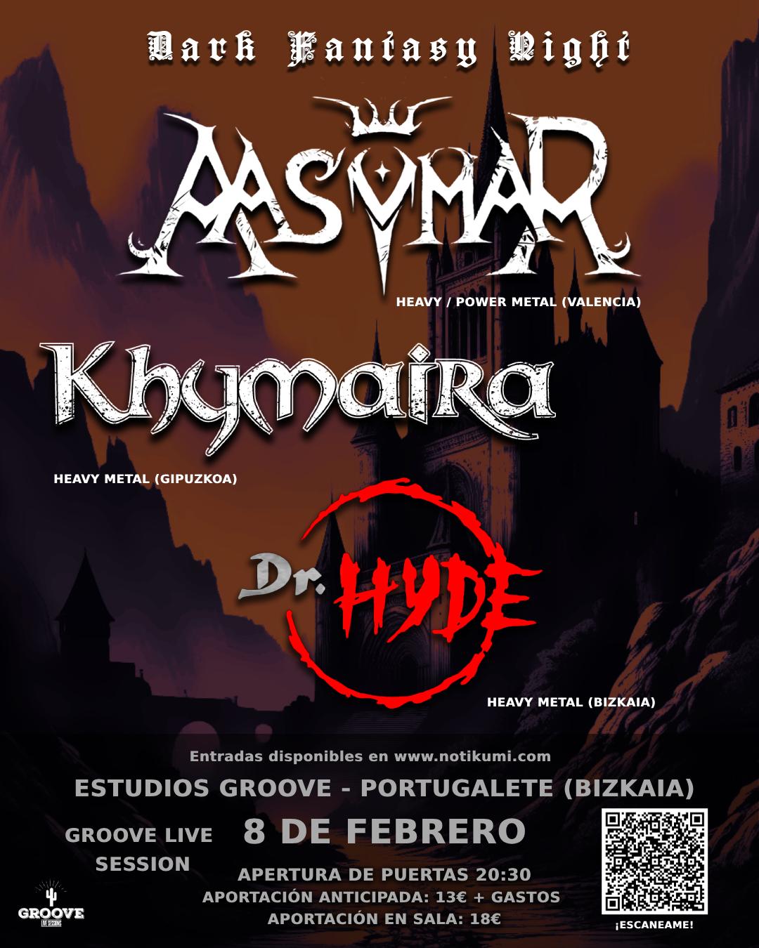 Dark Fantasy Night de heavy metal con la banda valenciana Aasymar, la guipuzcoana Khymaira y la vizcaína Dr. Hyde. 8 de febrero, sábado: Aasymar + Khymaira + Dr Hyde en Groove - Portugalete Aportaciones anticipadas: 13 € + gastos Aportaciones en sala: 18 €