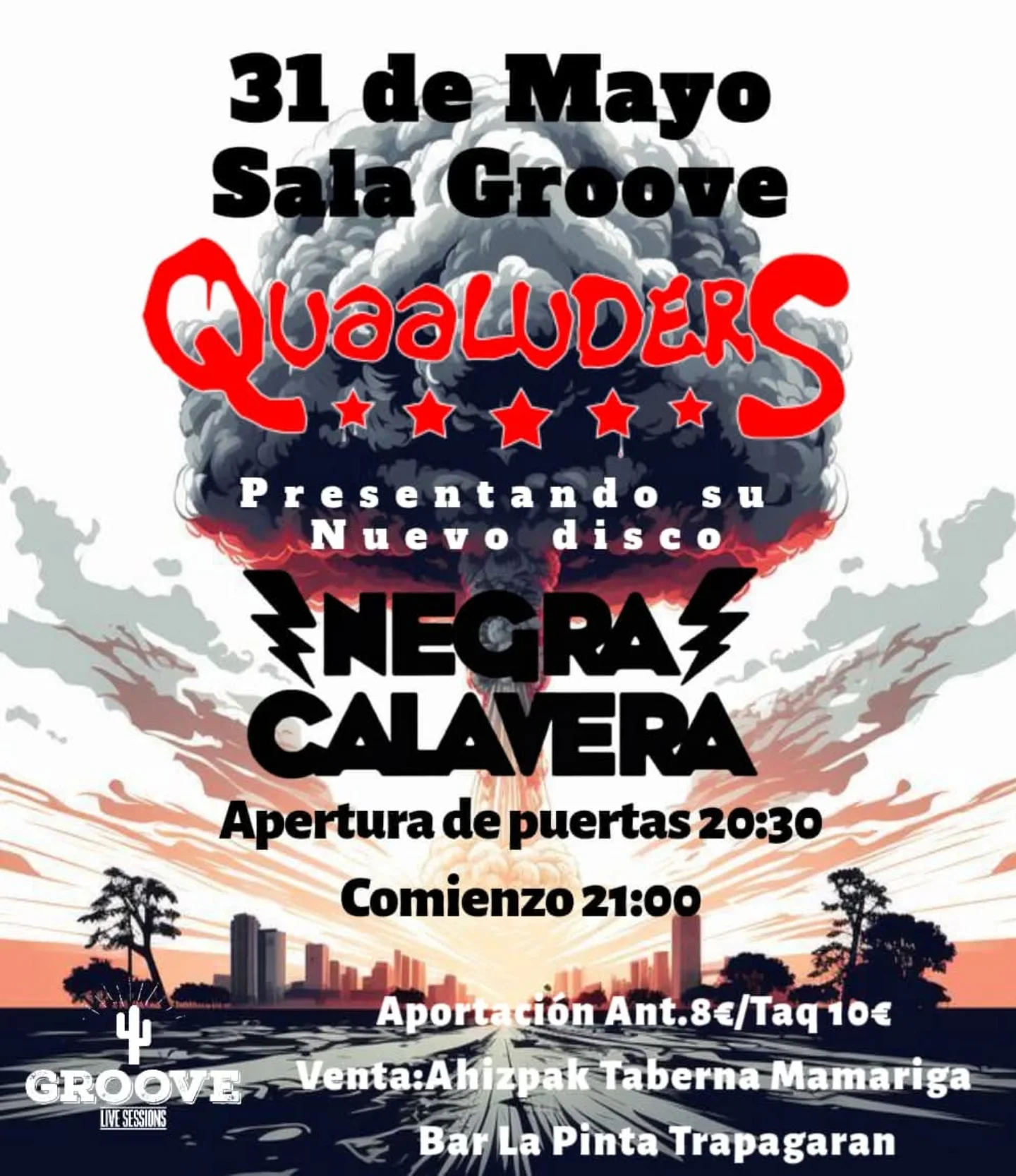 31 de mayo, sábado: Quaaluders + Negracalavera en Groove - Portugalete Aportaciones anticipadas: 8 € en PELOTAZO TABERNA (Portugalete), Ahizpak Taberna (Mamariga) y La pinta (Trapagaran). Aportaciones en sala: 10 € Noche con aires de punk-rock y High Energy Rock´n´roll con el combo santurtziarra #Quaaluders y la banda capitalina @negracalaveraband.