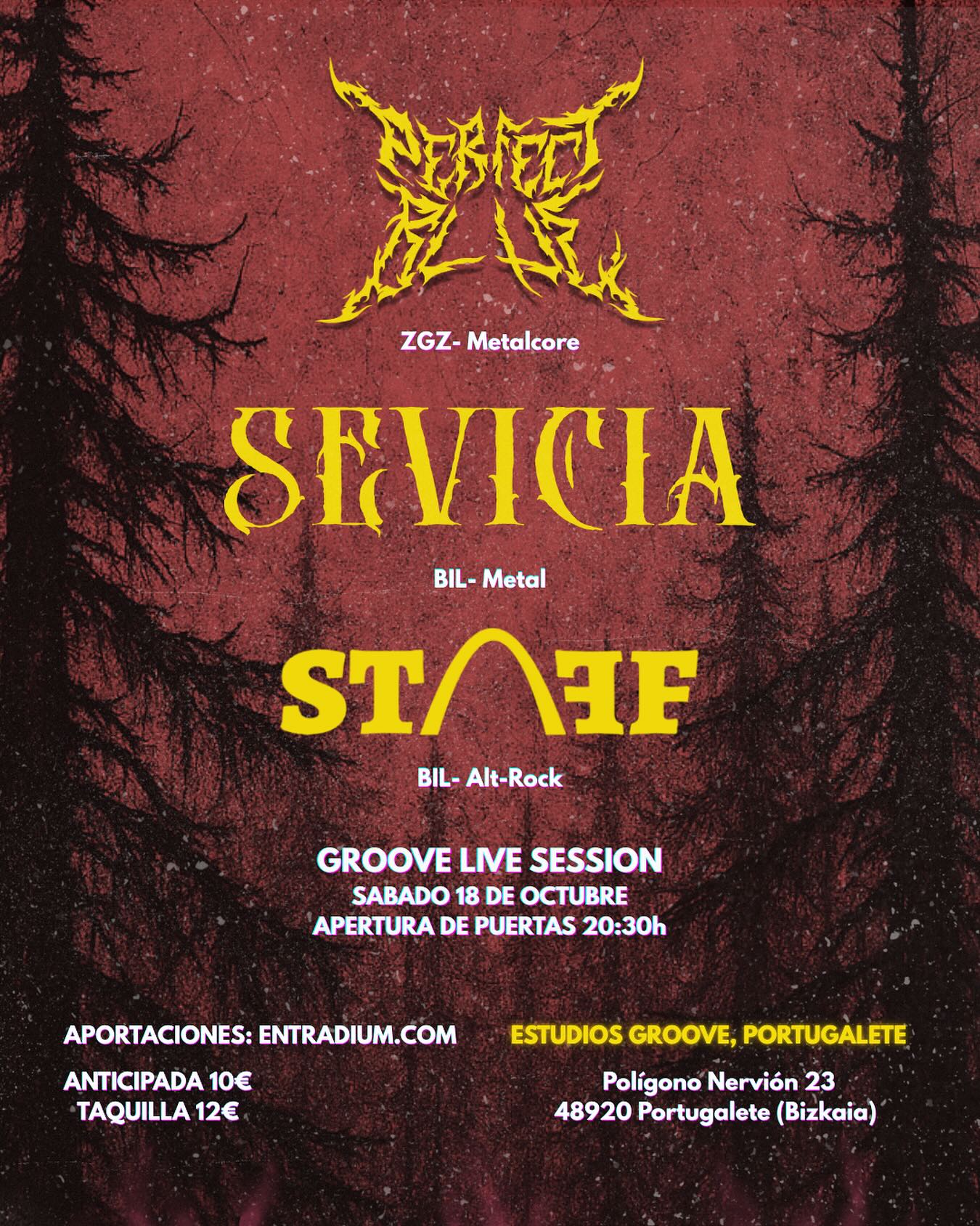 Sábado, 18 de octubre: Perfect Blue + Sevicia - Staff en Groove - Portugalete Aportaciones online: 10 € +gastos de gestiónhttps://entradium.com/.../groove-live-session-perfect... Aportaciones en sala: 12 € Tres bandas de la escena emergente de Bilbao y Zaragoza se unen en una noche cargada de fuerza y emoción, donde el metal y el rock alternativo se encuentran con la...
