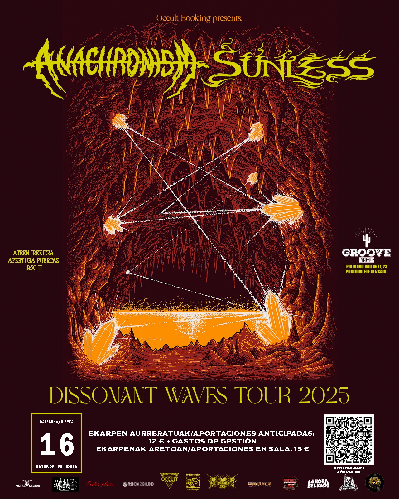 16 de octubre, jueves: Anachronism + Sunless en Groove - Portugalete Aportaciones anticipadas: 12 € + gastos de gestión https://woutick.com/.../anachronism-ch-sunless-usen... Aportaciones en sala: 15 € Noche de death metal con la banda suiza ANACHRONISM y la estadounidense SUNLESS.